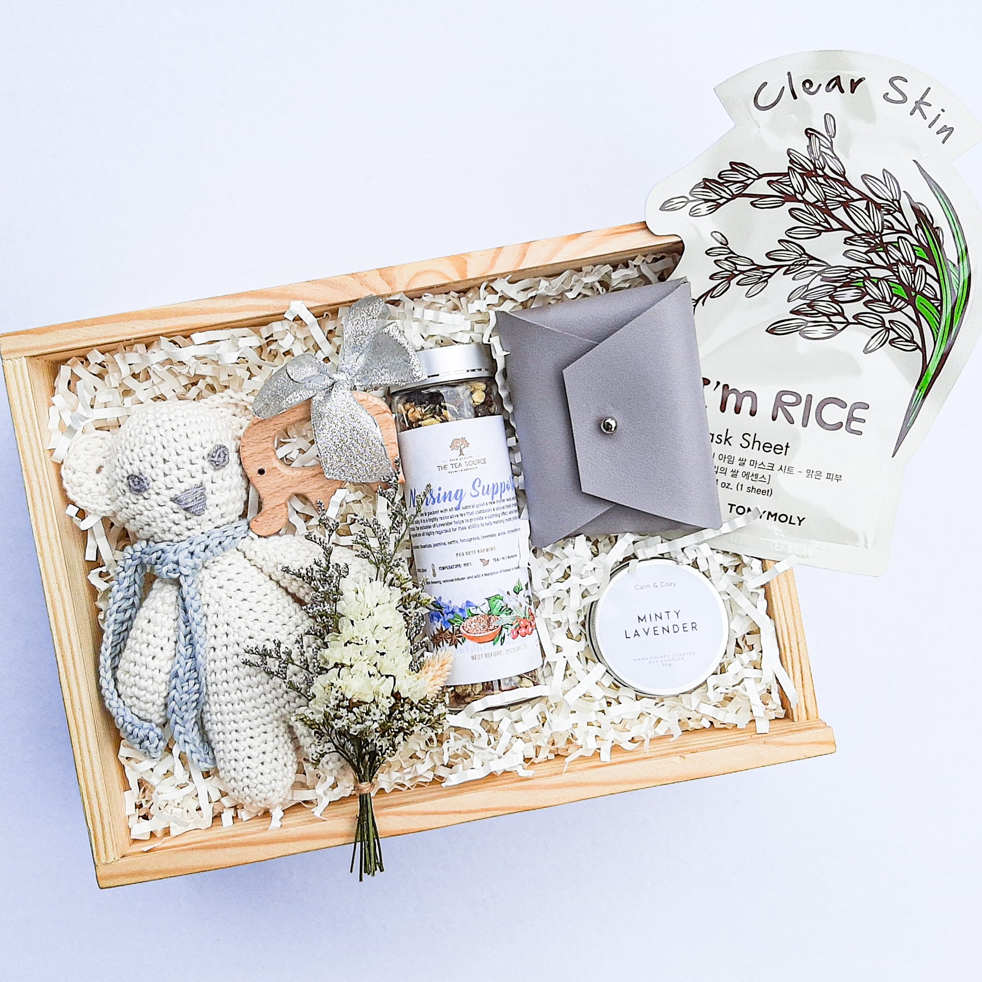 Created to make new mommas feel extra loved and cared for. Includes items to help relax and pamper mommas. We even threw in a cute handmade crochet toy + beech wood teether for her little one! Makes a lovely baby shower present too.